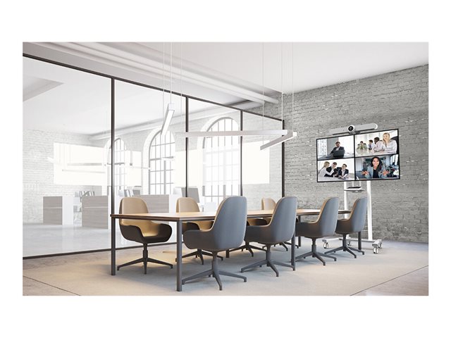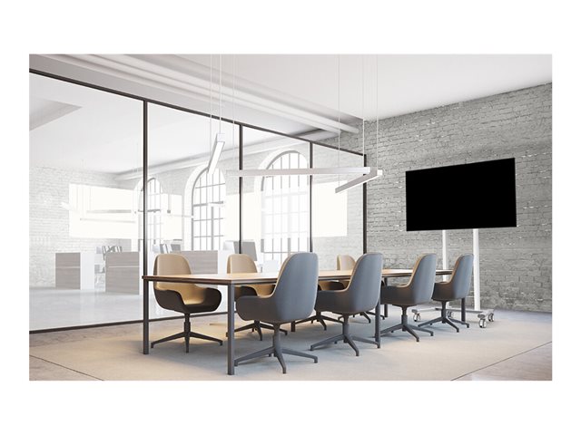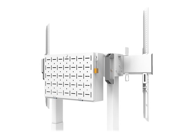The Neomounts FL55-875WH1 MOVE Lift is a mobile floor stand for displays up to 100" with a maximum weight capacity of 110kg. The trolley has 65cm motorized height adjustment (35mm/second), is operated with a wired remote control and features an anti-collision system for extra safety. A lockable, ventilated hardware compartment with cable opening is included and optional for installation. The MOVE Lift trolley features practical handles and four solid 10cm double locking caster wheels that allow you to move and use the floor stand wherever you like. Due to the large caster wheels, thresholds or carpets are no challenge to the FL55-875WH1. The open design wheelbase allows easy access to the (touch) display and enables easier movement around objects. A practical cable management bracket at the back of the trolley ensures easy and safe relocation. Additionally, at the bottom of the trolley a space with tie wrap holes is available to install a power strip. The floor stand is packed partially pre-assembled, to ensure fast and easy installation. The display can be secured by locking the brackets using a padlock. Additionally, the FL55-875WH1 is compactly packed for optimized transportation and storage. The universal AFL-875WH1 and AV1-875BL videobar and multimedia kits are optionally available and enable the installation of a separate cam shelf and multimedia device shelf to the trolley. Included to the kits is an adapter for respectively the Logitech Rally Bar (Mini) or Bose Professional VB-S/VB1.