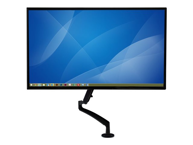 This slim, articulating desk-mount monitor arm lets you mount a flat-panel display to free up space on your desk or table. The full motion articulating arm make it easy to position your monitor for the perfect viewing angle and optimal comfort. With a stylish, slim design that looks great and takes up only a small amount of desk space, the single monitor arm lets you locate your display as needed while reclaiming valuable workspace. The monitor mount supports 12" to 34" displays with a maximum weight capacity of 15 lb. (7 kg). Mounting your display above the desk surface enables you to adjust your display height, position and viewing angles easily, for an ergonomic work environment. The full motion mount lets you extend the arm a full 23.46" (596 mm). Position your monitor for ideal viewing with the articulating monitor arm. You can tilt and swivel your display with a full range of motion across multiple axes. The spring-assisted height adjustment lets you raise or lower your monitor with smooth and effortless positioning. For viewing longer pages or blocks of code without having to scroll down your screen, the adjustable monitor arm also supports landscape-to-portrait display rotation. With its durable steel construction, the display mount securely holds your computer monitor. Setting up is easy. You can either clamp the mount to the side of your desk or table, or mount it through a grommet hole (hardware included). The integrated cable management channel keeps things neat and organized.
