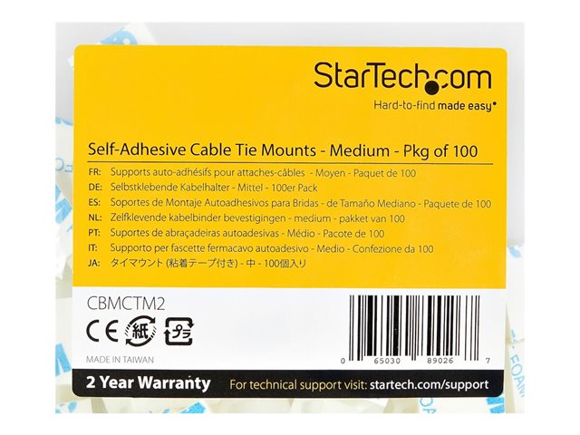 Startech 100 Pack Cable Tie Mounts with Adhesive Tape for 0.18 in. (4.6 mm) Wide Ties, Nylon/Plastic Zip Tie Mounts, Electrical/Network Cable Wrap Mounts / 94V-2 Fire & UL Rated TAA
