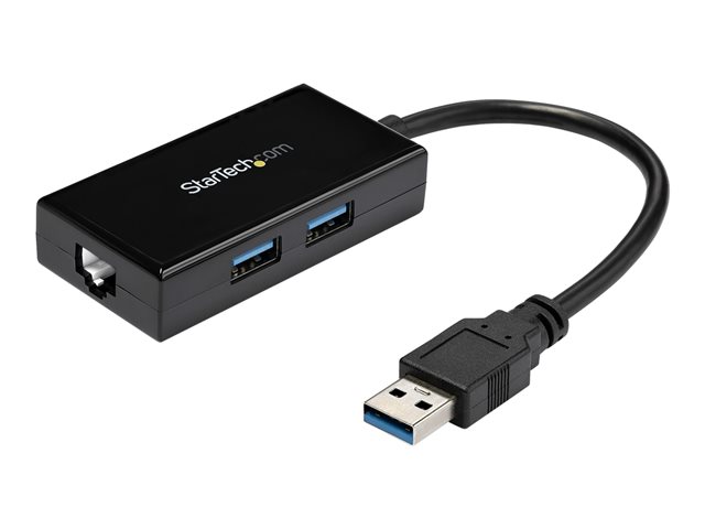 Add Gigabit Ethernet connectivity and two USB 3.0 ports to your laptop or tablet through a single USB port. Add powerful network access to your tablet, Ultrabook or laptop, even if it doesn't have a built-in RJ45 port. This USB 3.0 to Gigabit network adapter gives you wired network access - and provides two USB 3.0 pass-through ports allowing you to connect additional USB devices. Ideal for office or home use, the USB 3.0 network adapter supports full Gigabit bandwidth by harnessing the performance of USB 3.0 (5 Gbps). You can quickly access very large files over a Gigabit network, saving valuable time every day. Get up and running quickly. Simply plug this Ethernet cable adapter into the USB port on your laptop and connect to your network. The network adapter chipset provides native driver support, so you don't have to worry about installing additional software. Enhance the capabilities of your laptop or tablet by connecting USB devices like printers or external solid-state drive or hard drive enclosures using the two USB 3.0 ports. You can also connect your mouse, keyboard, flash drive or other low-power USB devices, with no extra power required. Compact and portable, this USB Gigabit network adapter is the ideal desktop network adapter or laptop accessory. You don't have to carry a power adapter with you to use it, because it's powered directly from the host USB port.